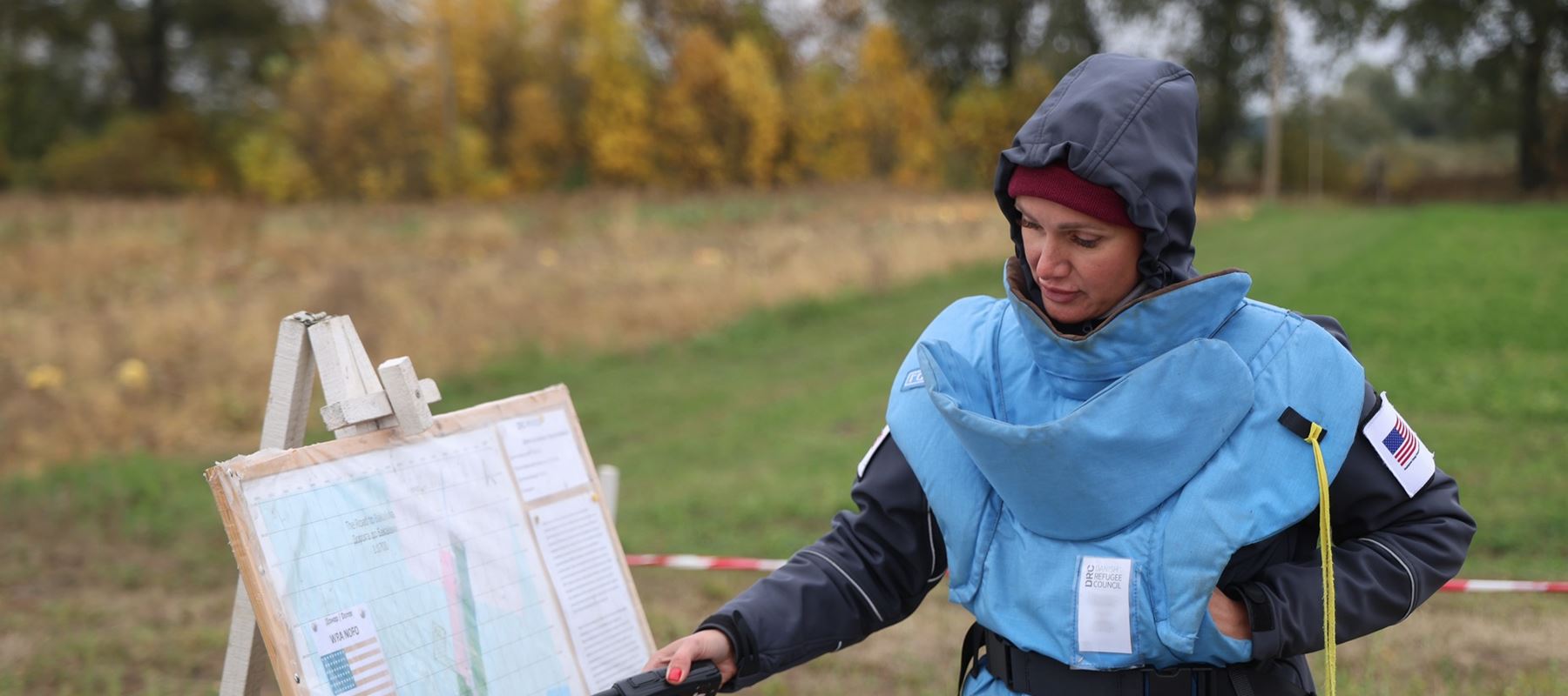 Following extensive training, Olena now works removing landmines in the north of the country.