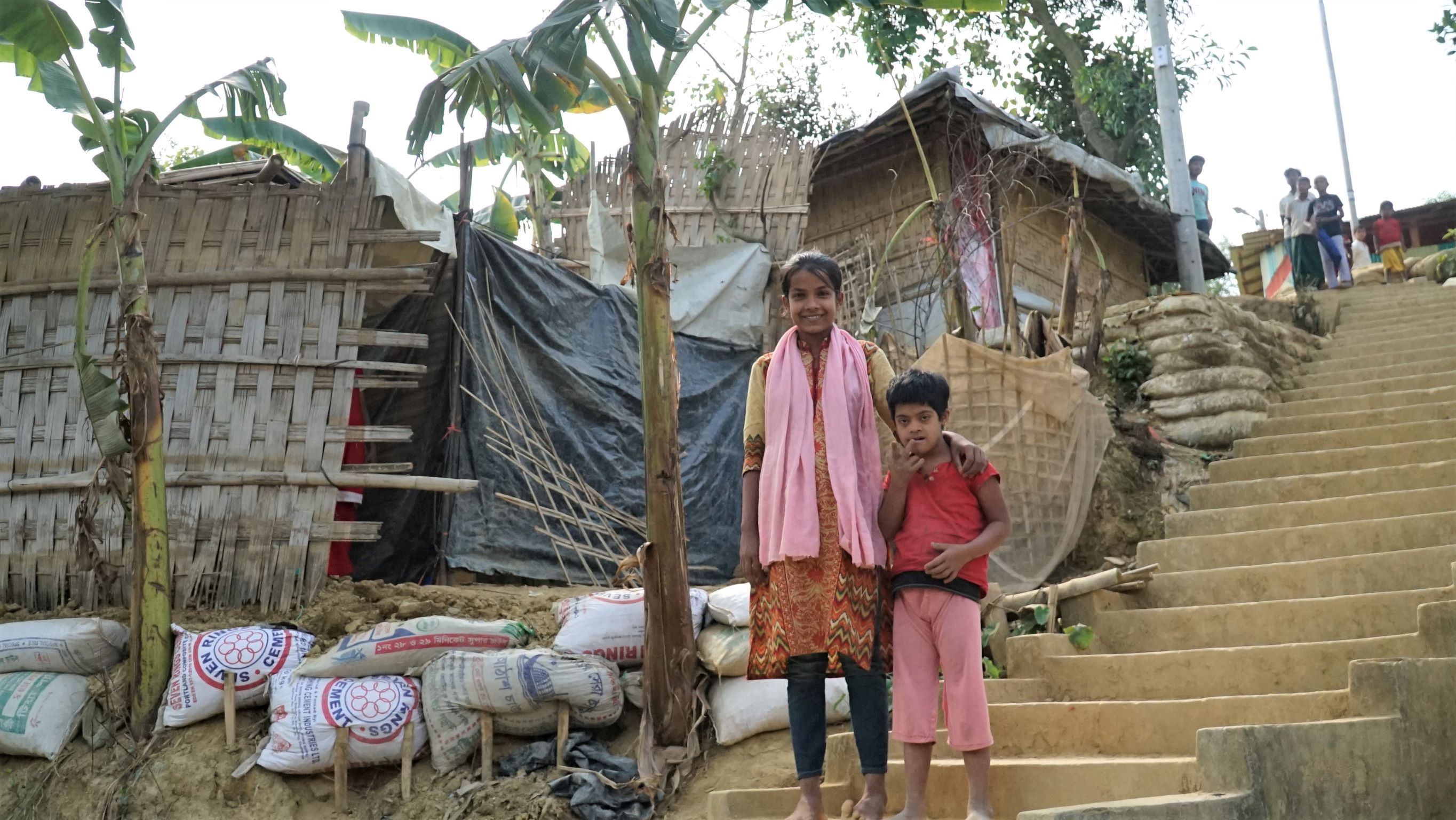 Sufaira shows the area around the family's hut. The slopes have been monsoon-proofed with sandbags and concrete steps with drains running down the sides. Right now, the camp is dry and the monsoon is still months away. Umaira makes a peace sign for the photographer, and Sufaira puts her arm around her younger sister's shoulder.
